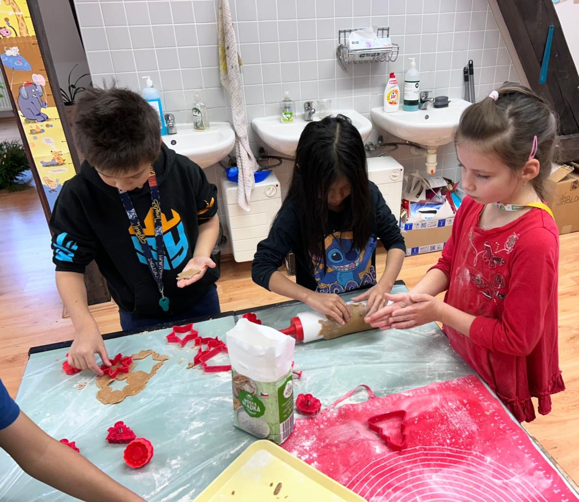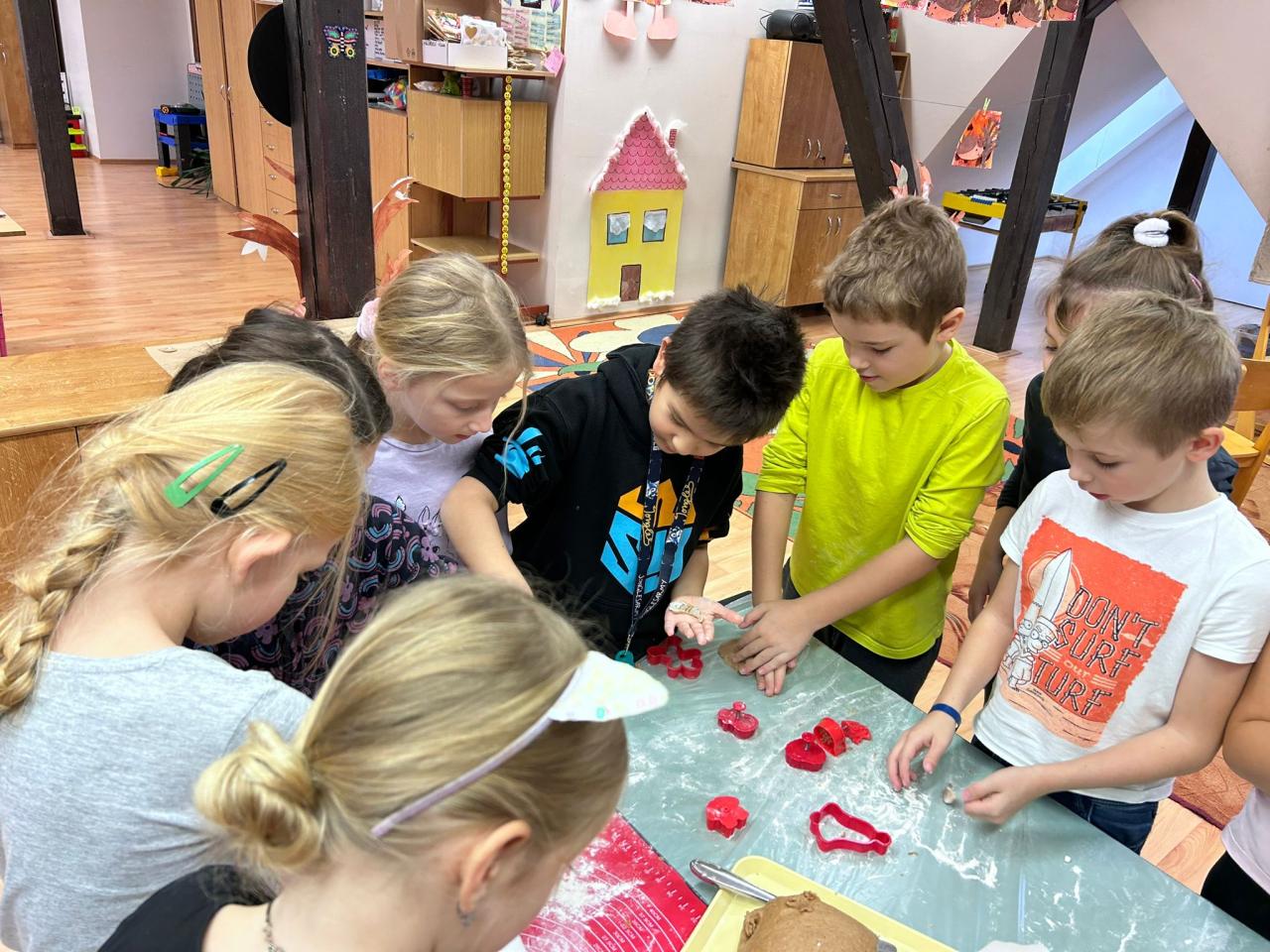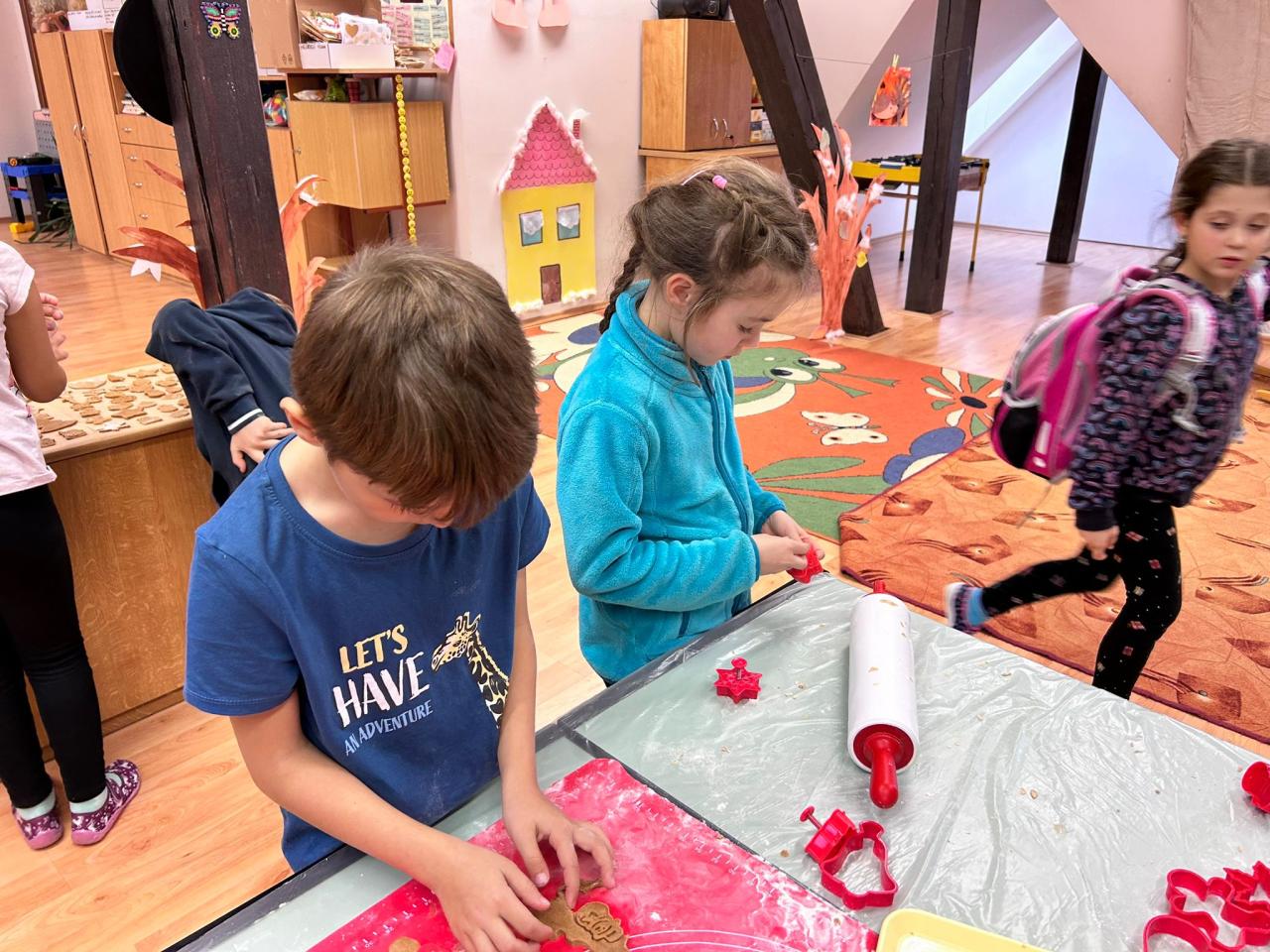 Jedna maminka se nám postarala o těsto a pomohla i s pečením. Někteří chlapci byli z aktivity nadšení více, než dívky, ale v závěru jsme si to užili úplně všichni. Kdo měl zájem, mohl si sám těsto vyválet a společně jsme pak vykrájeli různé tvary perníčků. Překvapivě to bylo tak rychlé, že jsme za chvilku neměli těsto žádné a brzdilo nás jen pomalé pečení trouby. Na ozdobení však nezbyl jeden jediný, protože děti ochutnávaly hodně svědomitě. Když už jsme měli všechna vykrajována a válečky venku, tak jsme použili modelovací hmotu a vykrojili i několik ozdobiček na vánoční stromek.
