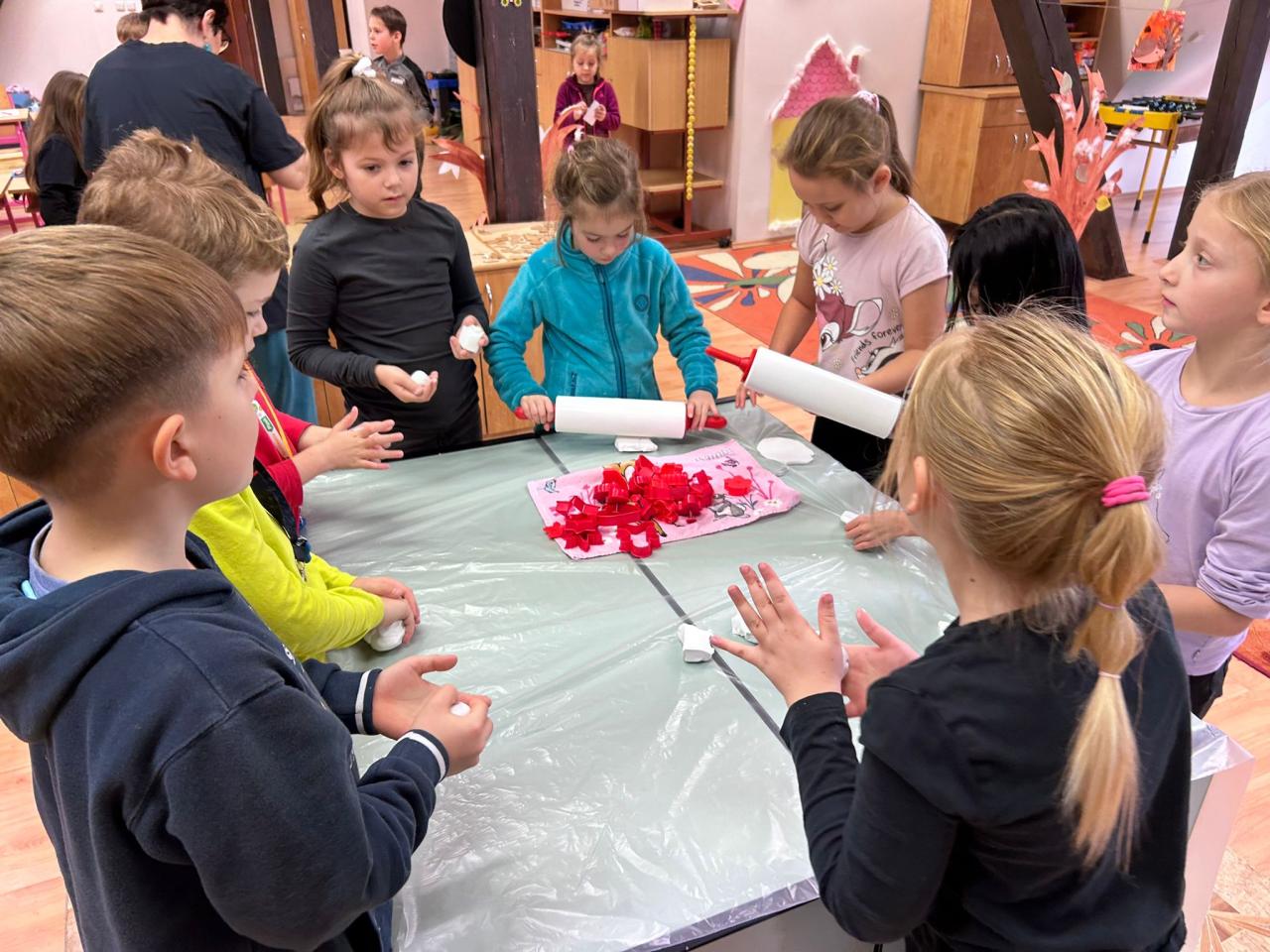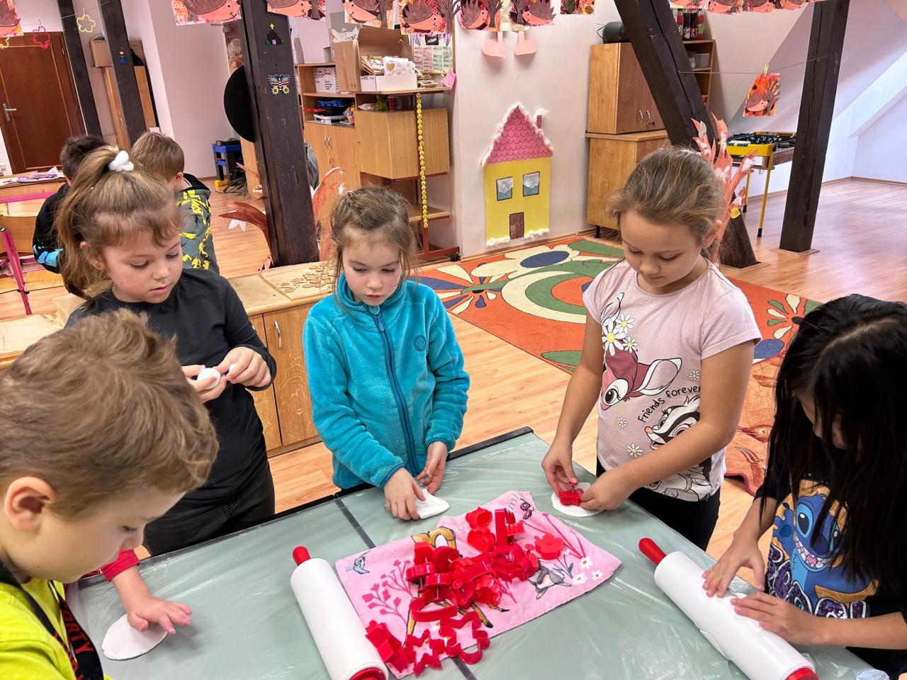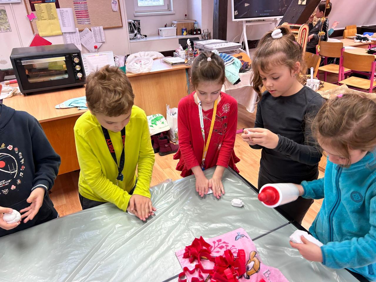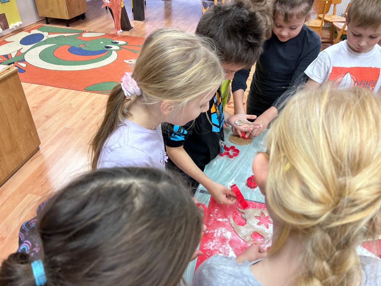 Jedna maminka se nám postarala o těsto a pomohla i s pečením. Někteří chlapci byli z aktivity nadšení více, než dívky, ale v závěru jsme si to užili úplně všichni. Kdo měl zájem, mohl si sám těsto vyválet a společně jsme pak vykrájeli různé tvary perníčků. Překvapivě to bylo tak rychlé, že jsme za chvilku neměli těsto žádné a brzdilo nás jen pomalé pečení trouby. Na ozdobení však nezbyl jeden jediný, protože děti ochutnávaly hodně svědomitě. Když už jsme měli všechna vykrajována a válečky venku, tak jsme použili modelovací hmotu a vykrojili i několik ozdobiček na vánoční stromek.
